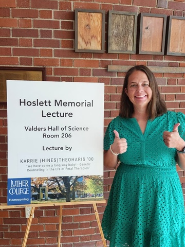 Alumni Karrie (Hines) Theoharis gave the 52nd Sherman Hoslett Lecture at Luther College (Decorah, Iowa). Karrie graduated from Luther in 2000, completed her PhD in the laboratory of Lori Wallrath in 2006, and then obtained a Master's degree in Genetics Counseling in 2008 from the University of Minnesota. Karrie specialized in prenatal care, including the newly possible fetal therapy for cystic fibrosis.